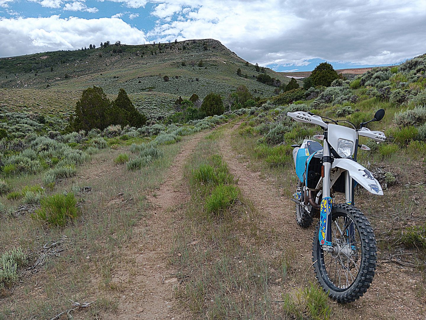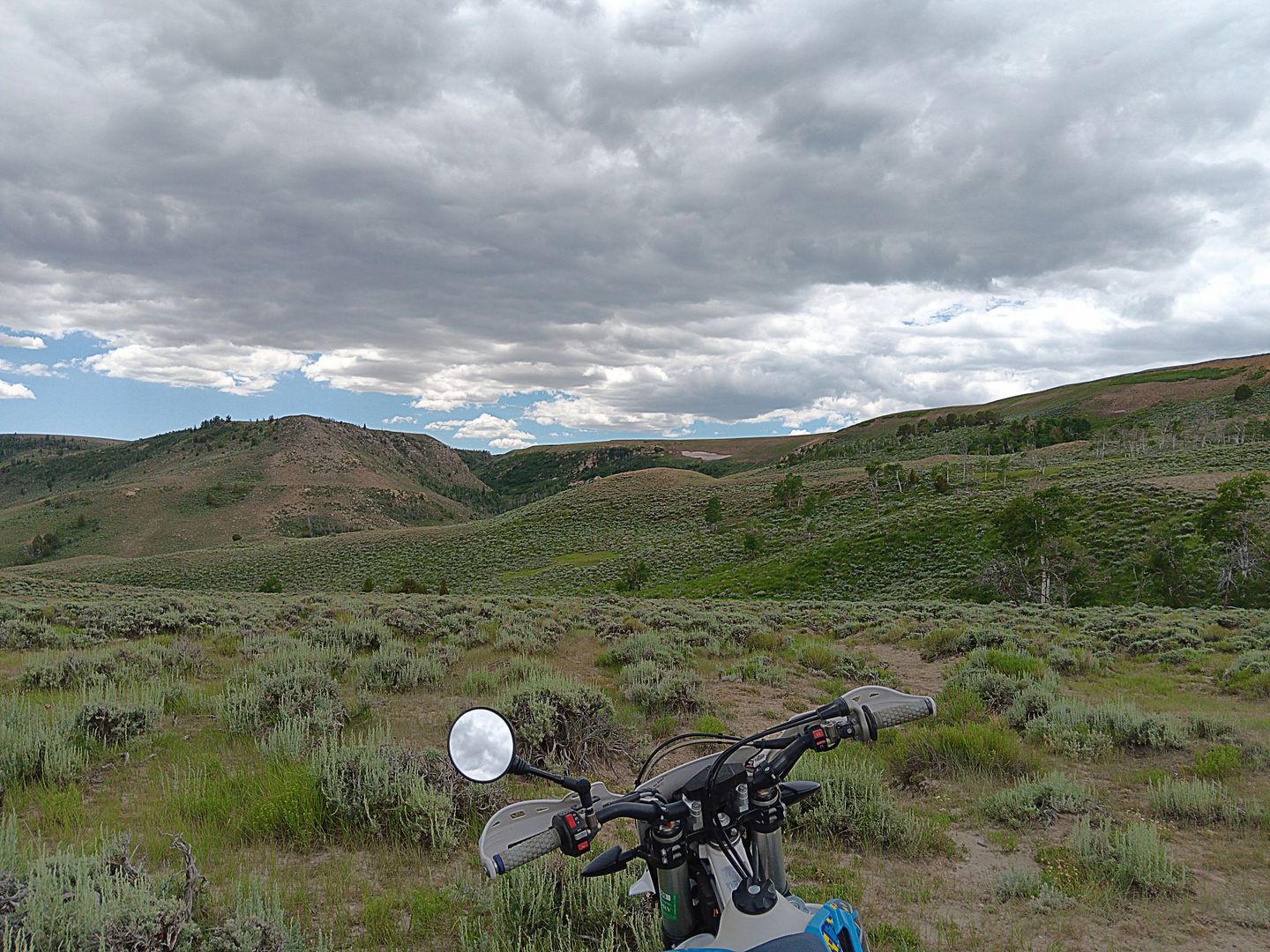 The prairie rolls on endlessly in all directions, or so it would seem. Any direction out of town will take you further on the dirt than your gas tank will get you. That's why we usually get about 50 miles out, then think about making a return trip, since most routes won't take you anywhere near a gas station. Other times, we will have to trailer the bikes out to an area we want to explore,to cut down on overall mileage. But last Monday, we rode from the ranch to find yet another historic homestead and some pretty side trails. No rain to speak of on that day, but the clouds were certainly welcomed when they gathered in the early afternoon. 91.5 miles later, we found ourselves rolling back through the ranch gates, ready to call it a day.