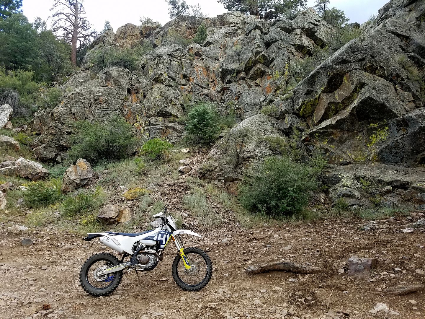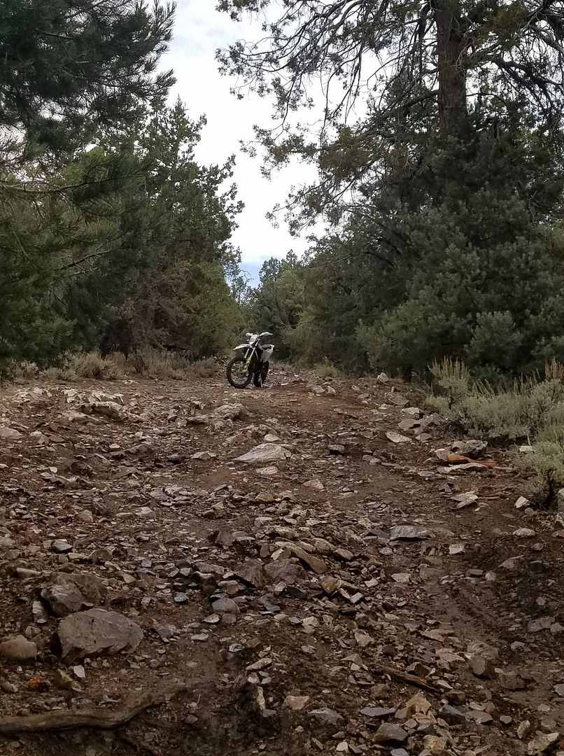 I hit the road to get to my first trail head, and the temperature didn't feel too bad at speed. More clouds gathered after I had been on the dirt route for an hour. B y the time I reached 3N016, it was sullenly overcast with a few drops of moisture starting to sprinkle out of the sky. The temperature must have dropped by ten degrees, and the ground was looking sort of damp. There were puddles left from the Saturday storm. Not too many people out. I guess the weather scared most of them off. By the time I reached Arctic Canyon trail, it was a light and steady rain. The forest smelled so good, and the dirt was perfect. My 501 was one with the universe for this type of riding. I suddenly felt so energized by the wonderful, cool conditions, that I decided to revisit one old trail that I hadn't ridden on in 7 years. It was a great reunion to be on that trail.