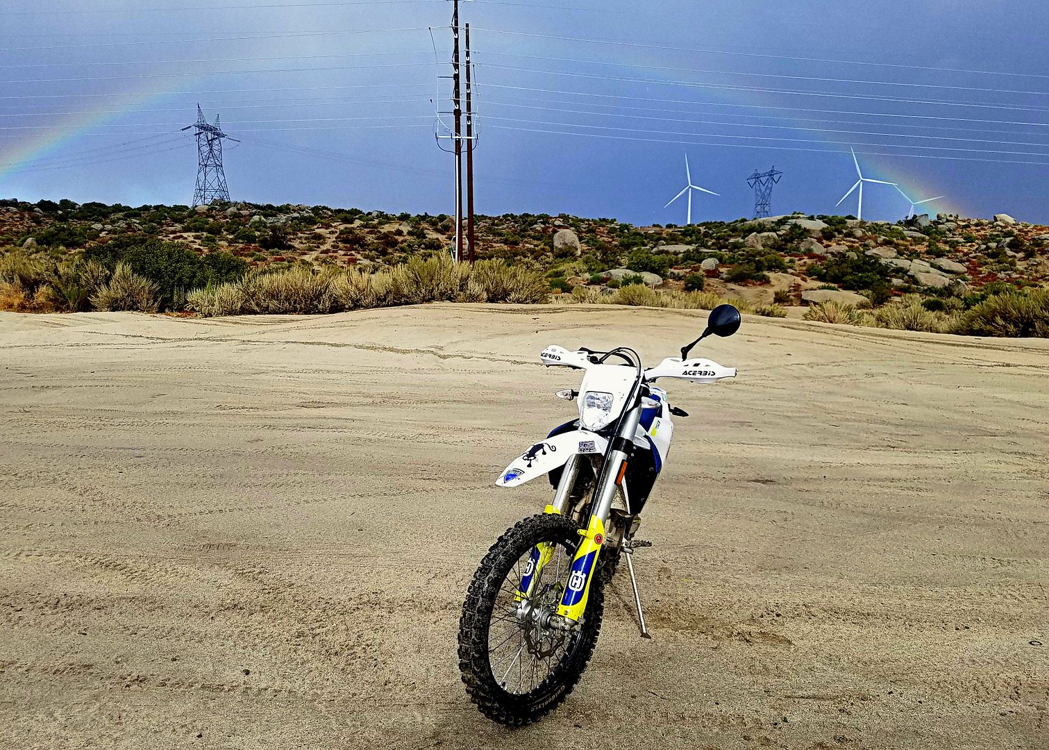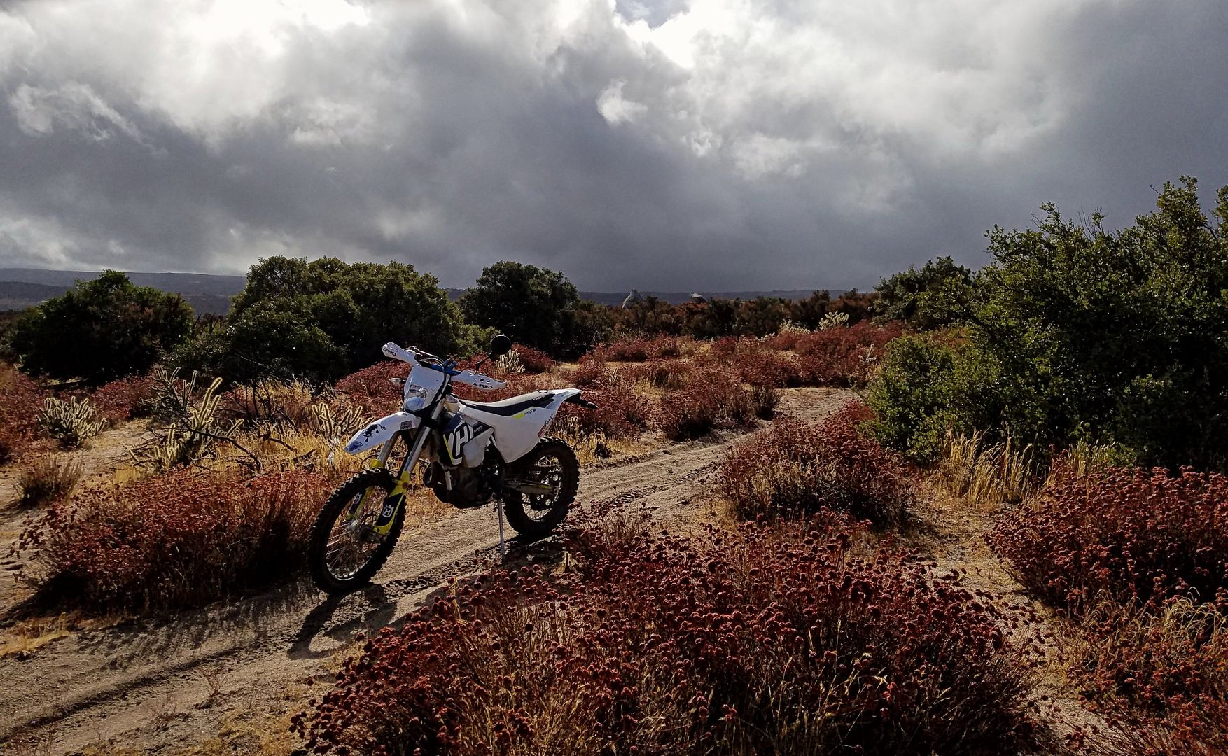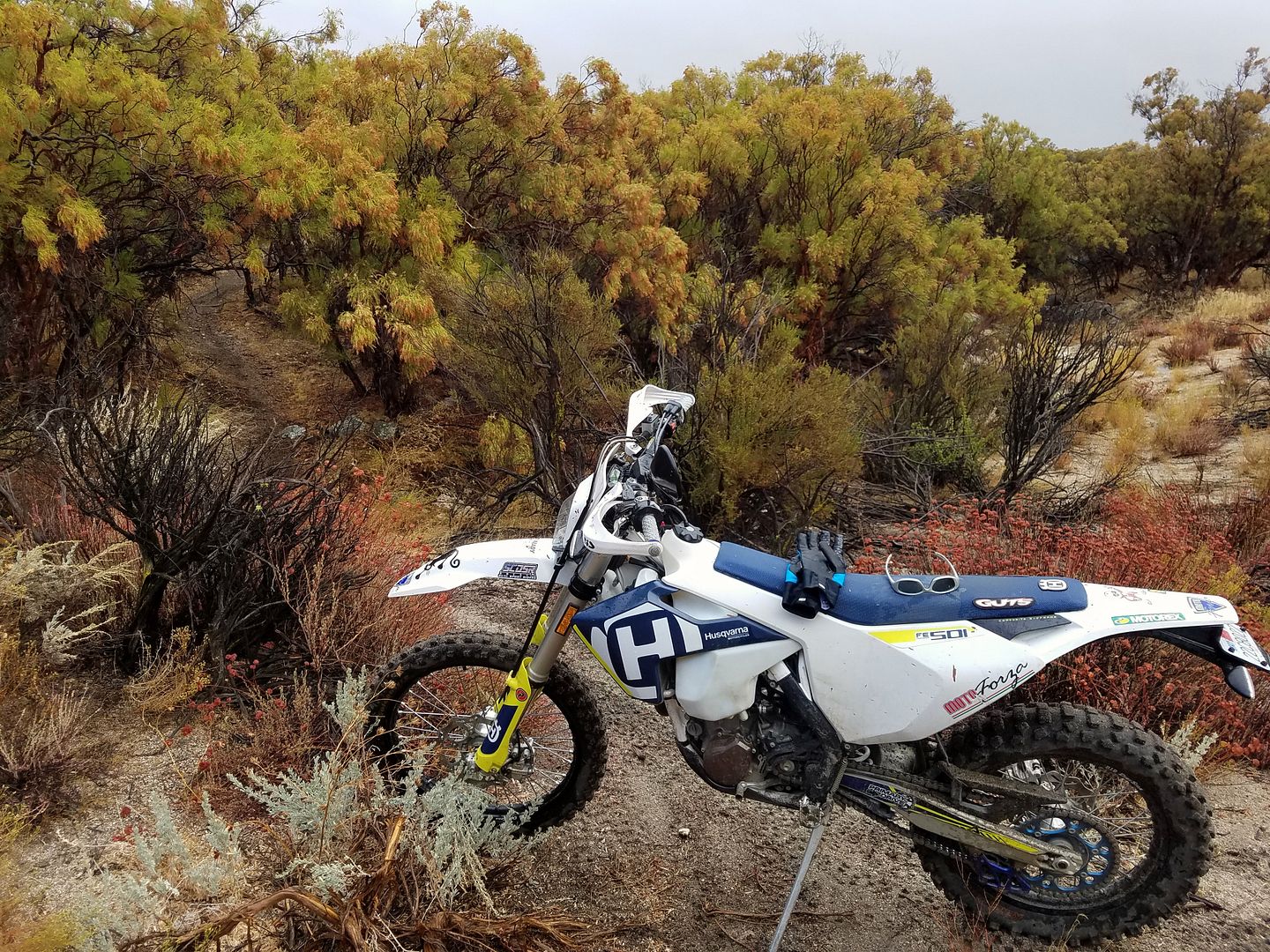 Things didn't look so good as I drove out. The wind, rain and finally sleet or hail were all pretty fierce. However, the weather is often more benign once you get over the pass on I-8, so I was hopeful. But it was not to be. There were a number of people in the staging area when I arrived, but the rain squalls and wind had most of them loading up their bikes and gear at this time. Also the weather app was incorrect about the temperature. It was 38 when I got there, and never got any warmer than 41 throughout the day. I wasn't certain that I wanted to unload my bike and hit the trail at this point. To make things worse, I discovered that my rain gear had not been put back into the Jeep after my last weather ride, some two years ago. I had brought a nice waterproof enduro jacket and gloves along...but I didn't think my legs would stay even the slightest bit warm without my rain pants. I decided to drive back home....then there was a momentary break in the weather, and I discovered an old pair of Frogg Toggs rain pants in the car. I had just enough time to get suited up and pull the bike down before the clouds broke loose again.