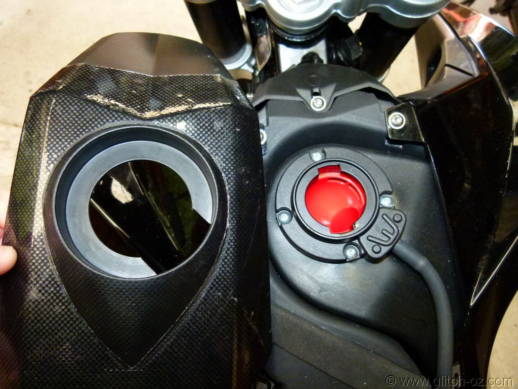 The OEM unit necessitates the short rubber tube to fit behind the M/C and potentially rub on the swingarm.